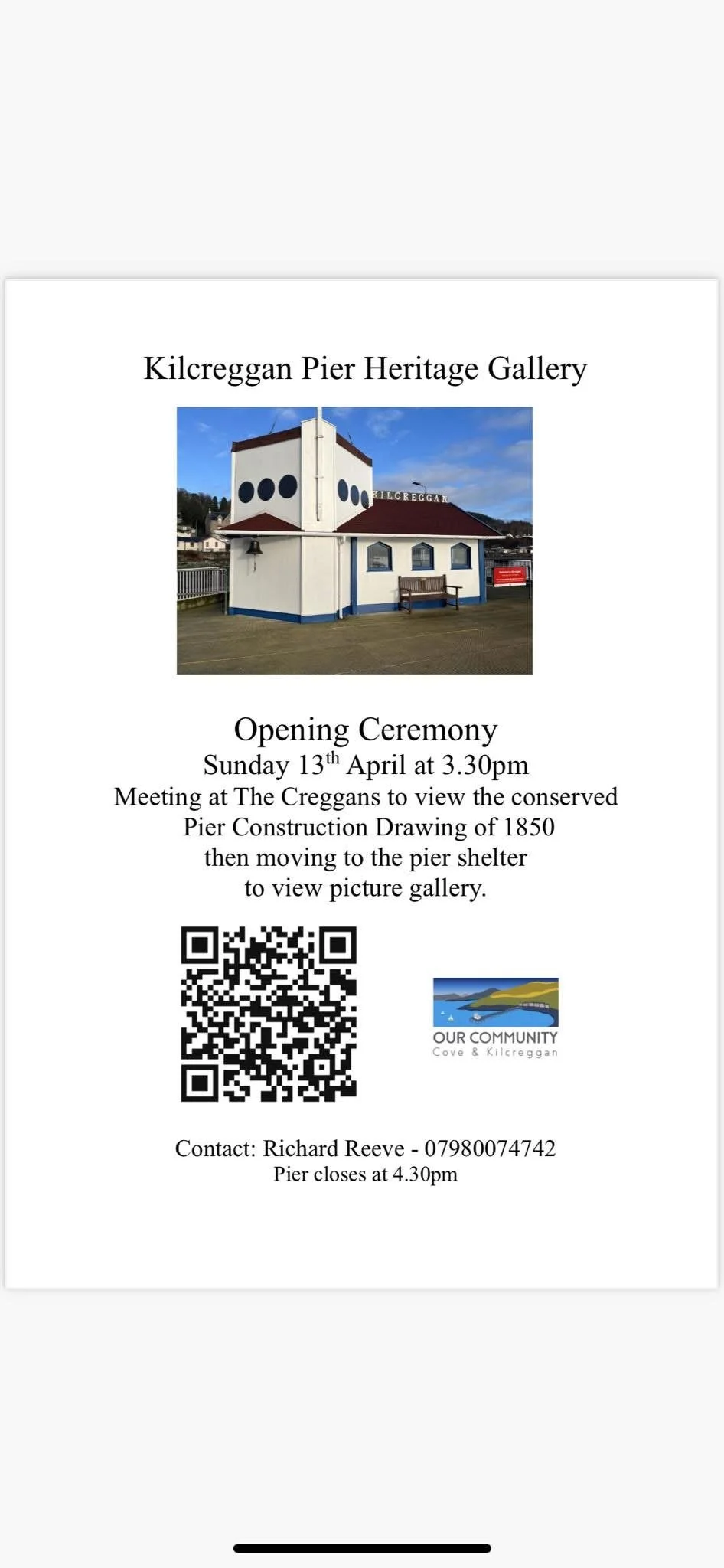 The Pier Heritage Open Gallery is a display of 12 photographic images of the Kilcreggan Pier and the Firth of the Clyde’s busy waterways from the 19th & 20th centuries with QR codes giving heritage information. It was opened in April 2025 and the QR code receives approximately 100 views per month.